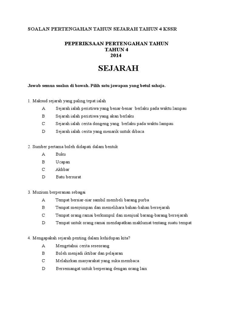 Contoh Soalan Sejarah Tahun 4 Kssr. Soalan sejarah tahun 4 ujian 1 bulan mac 2017 mengikut kurikulum kssr. Soalan pertengahan tahun sejarah tahun 4 kssr sejarah peperiksaan pertengahan tahun tahun 4 2014 â sejarah â jangan buka kertas soalan ini sehingga . Himpunan soalan pertengahan tahun sejarah tahun 4. Bayangkan kalau seawal 10 tahun dah mula rasa sejarah tu membebankan, mencetuskan tekanan, dlm 6 tahun akan.